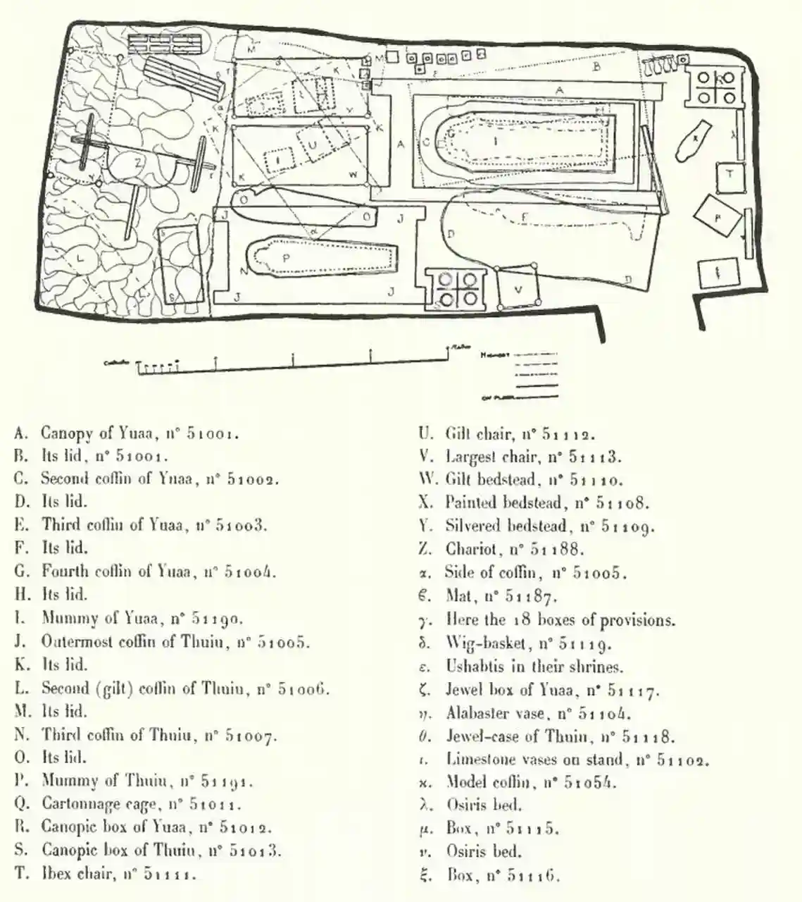 The tomb of Yuya and Thuya, also known by its tomb number KV46, is the burial place of the ancient Egyptian noble Yuya and his wife Thuya, in the Valley of the Kings. They were the parents of Queen Tiye, the chief wife of Pharaoh Amenhotep III. Their tomb was discovered in February 1905 by the Egyptologist James E. Quibell, excavating under the sponsorship of American millionaire Theodore M. Davis. The tomb was robbed in antiquity but preserved a great deal of its original contents including chests, beds, chairs, a chariot, and numerous storage jars. Additionally, the riffled but undamaged mummies of Yuya and Thuya were found within their disturbed coffin sets. Prior to the discovery of the tomb of Tutankhamun, this was considered to be one of the greatest discoveries in Egyptology. Read more on Wikipedia
