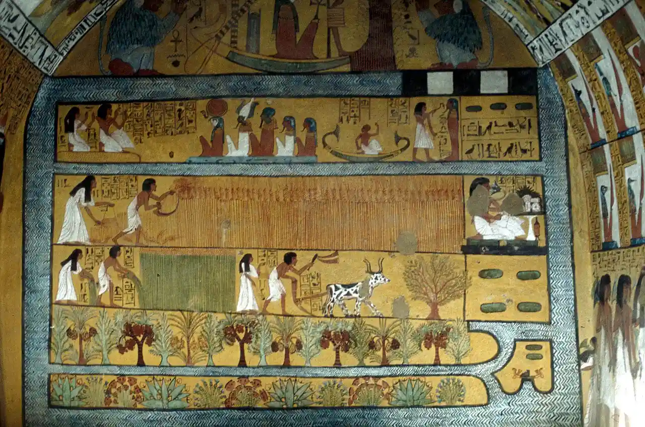 TT1 is the burial place of the ancient Egyptian official Sennedjem and members of his family in Deir el-Medina, on the west bank of the Nile opposite Luxor. The funerary complex consists of three pyramid-shaped chapels dedicated to, from south to north, Sennedjem's father or brother, Sennedjem himself, and to Sennedjem's son Khonsu. Of the three shafts associated with the chapels, only the shaft in front of Sennedjem's chapel was unrobbed. It led to a series of underground rooms, including the extensively decorated burial chamber. Read more on Wikipedia