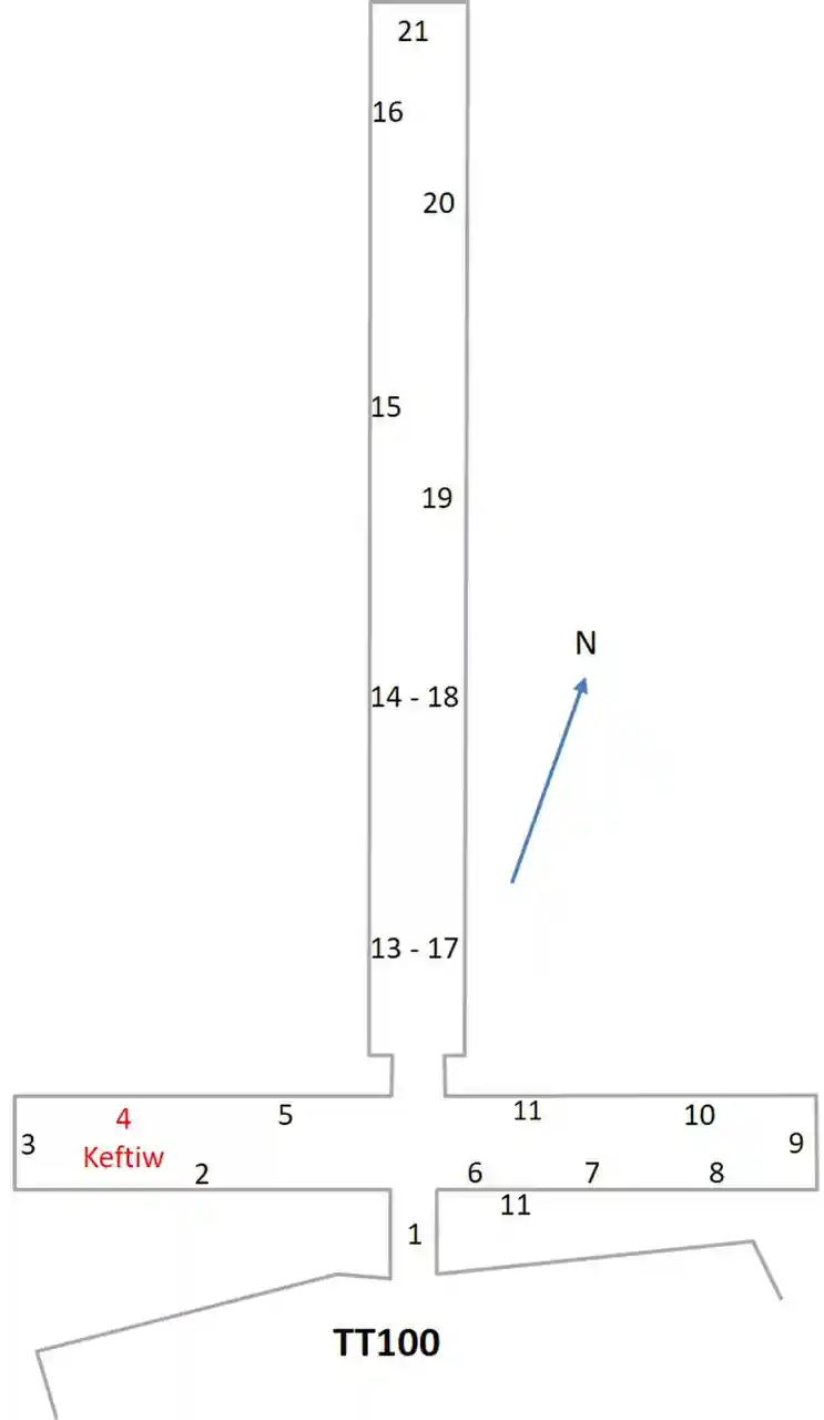 The Theban Tomb TT100 is located in Sheikh Abd el-Qurna, part of the Theban Necropolis, on the west bank of the Nile, opposite to Luxor. It is the mortuary chapel of the ancient Egyptian vizier Rekhmire. There is no burial chamber next to this chapel. The vizier's tomb is elsewhere, perhaps even in the Valley of the Kings. Read more on Wikipedia