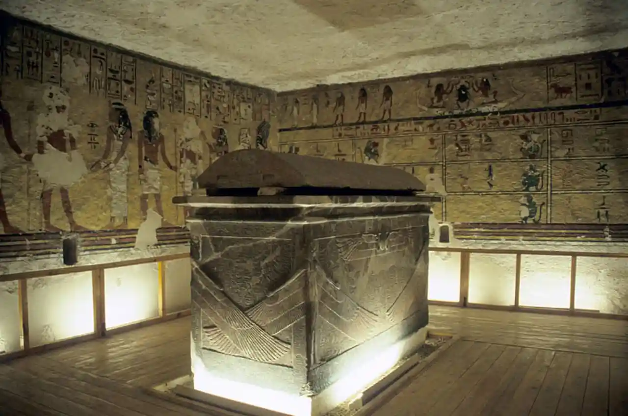 Tomb WV23, also known as KV23, is located in the Western Valley of the Kings near modern-day Luxor, and was the tomb of Pharaoh Ay of the Eighteenth Dynasty. The tomb was discovered by Giovanni Battista Belzoni in the winter of 1816. Its architecture is similar to that of the tomb of Akhenaten, with a straight descending corridor leading to a "well chamber" that has no shaft. This leads to the burial chamber, which now contains the reconstructed sarcophagus, which had been smashed in antiquity. The tomb had also been anciently desecrated, with many instances of Ay's image or name erased from the wall paintings. Its decoration is similar in content and colour to that of the tomb of Tutankhamun (KV62), with a few differences. On the eastern wall there is a depiction of a fishing and fowling scene, which is not shown in other royal tombs, normally appearing in burials of nobility. Read more on Wikipedia