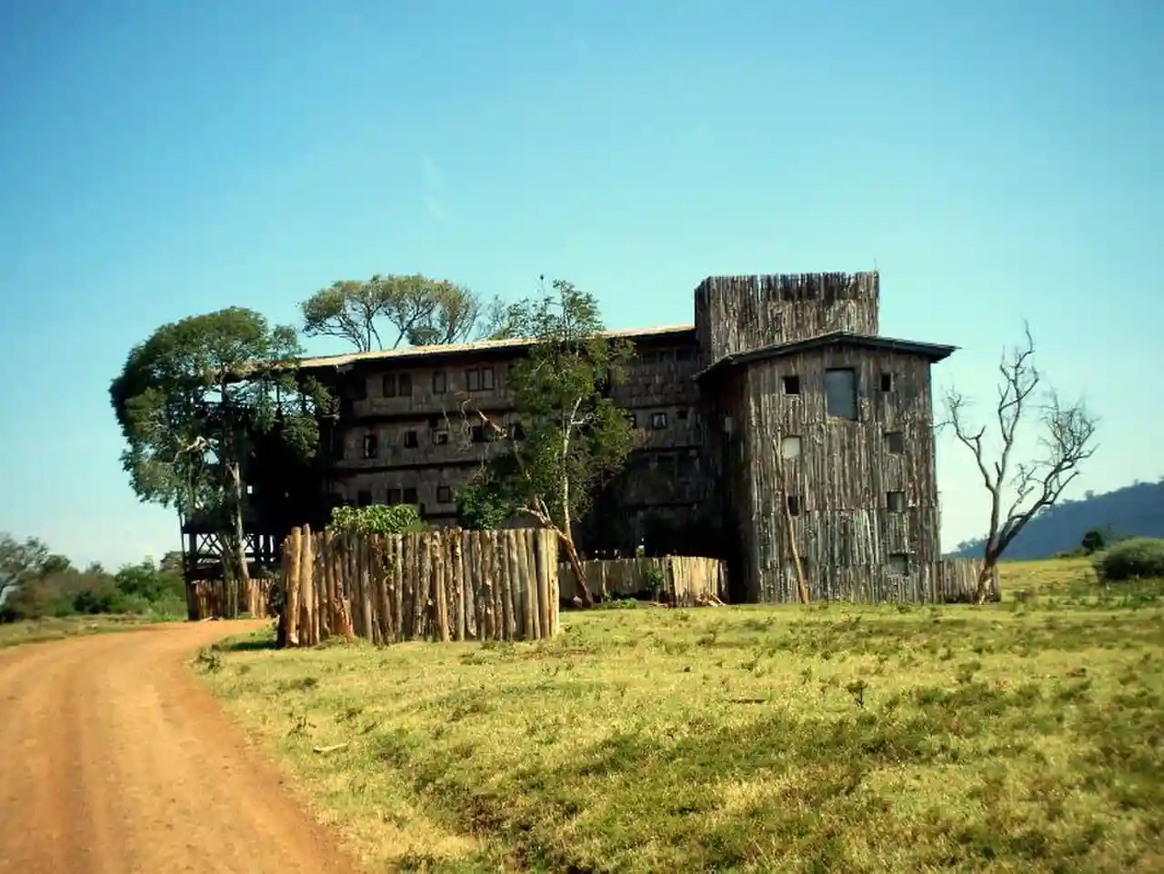 Treetops Hotel was a hotel in Aberdare National Park in Kenya near the township of Nyeri, 1,966 m (6,450 ft) above sea level on the Aberdare Range and in sight of Mount Kenya. First opened in 1932 by Eric Sherbrooke Walker, it was built into the tops of the trees of Aberdare National Park as a treehouse, offering the guests a close view of the local wildlife. The idea was to provide a machan (hunting platform on a tree during shikar in India) experience in relative safety and comfort. From the original modest two-room tree house, it has grown into a 35-room hotel. The original structure was burned down by The Kenya Land and Freedom Army (KLFA) during the 1954 Mau Mau Uprising, but the hotel was rebuilt near the same waterhole and has become fashionable for many of the rich and famous. It includes observation lounges and ground-level photographic hides from which guests can observe the local wildlife which comes to the nearby waterholes. The hotel closed in October 2021. Read more on Wikipedia