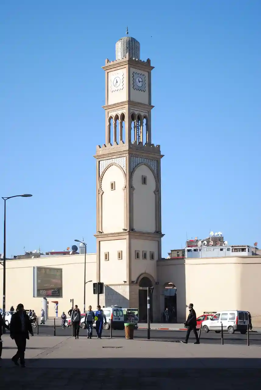 The Casablanca Clock Tower (, ) is a clock tower in Casablanca, Morocco. Located in United Nations Square, the tower is a 1993 reproduction of one of the oldest French-built structures in the city. The original tower was built in 1909 by the French commander Charles Martial Joseph Dessigny, and designed by Le Capitaine du Génie Bouillot, as an identical copy of one he had built in Aïn Séfra when stationed there previously. Read more on Wikipedia