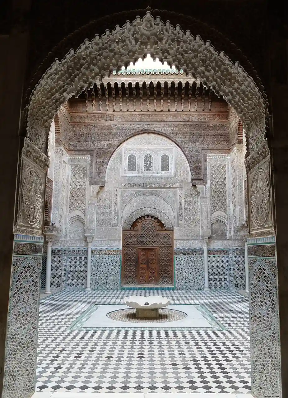 The Al-Attarine Madrasa or Medersa al-Attarine () is a madrasa in Fes, Morocco, near the Al-Qarawiyyin Mosque. It was built by the Marinid sultan Uthman II Abu Said (r. 1310-1331) in 1323-5. The madrasa takes its name from the Souk al-Attarine, the spice and perfume market. It is considered one of the highest achievements of Marinid architecture due to its rich and harmonious decoration and its efficient use of limited space. Read more on Wikipedia