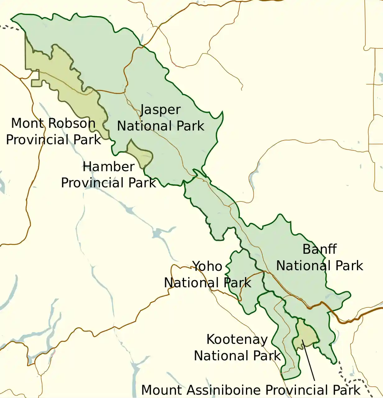 The Canadian Rocky Mountain Parks World Heritage Site consists of seven contiguous parks including four national parks (Banff, Jasper, Kootenay, and Yoho) and three British Columbia provincial parks (Hamber, Mount Assiniboine, and Mount Robson). Read more on Wikipedia