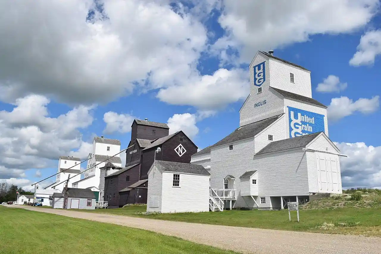The Inglis elevator row is a row of five wooden grain elevators located alongside the former Canadian Pacific Railway track bed, in the village of Inglis, Manitoba, Canada. Because so many traditional country elevators have been demolished throughout Western Canada, the Inglis elevator row preserves rare examples of a formerly common sight from "the golden age of grain". In recognition of the elevators in Inglis being the last elevator row in Canada, they have been fully restored and protected as a National Historic Site of Canada. Read more on Wikipedia