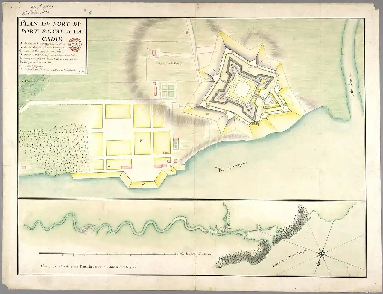 Port Royal (1605–1713) was a historic settlement based around the upper Annapolis Basin in Nova Scotia, Canada, and the predecessor of the modern town of Annapolis Royal. It was the first successful attempt by Europeans to establish a permanent settlement in what is today known as Canada. Port Royal was a key step in the development of New France and was the first permanent base of operations of the explorer Samuel de Champlain, who would later found Quebec in 1608, and the farmer Louis Hébert, who would resettle at Quebec in 1617. For most of its existence, it was the capital of the New France colony of Acadia. Read more on Wikipedia