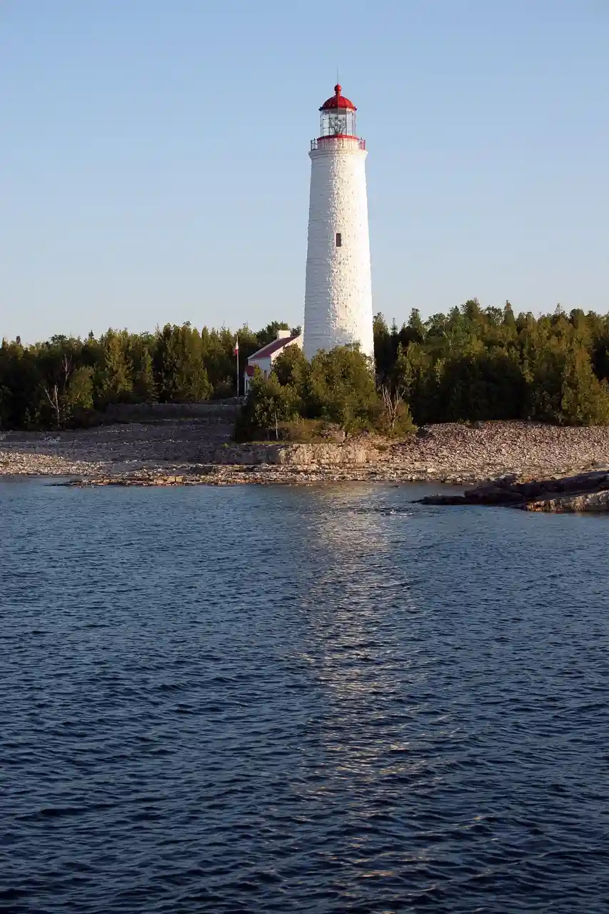 The Cove Island Light, at Gig Point on the island, is located in Fathom Five National Marine Park, but is not part of the Park. It is situated on the Bruce Peninsula, Ontario, Canada. It has been a navigational aid in the narrow channel between Lake Huron and Georgian Bay since 30 October 1858. It was the first of six stone Imperial Towers to be completed; all were illuminated by 1859. Most other lighthouses of the era were built of brick, wood, iron or concrete. Read more on Wikipedia