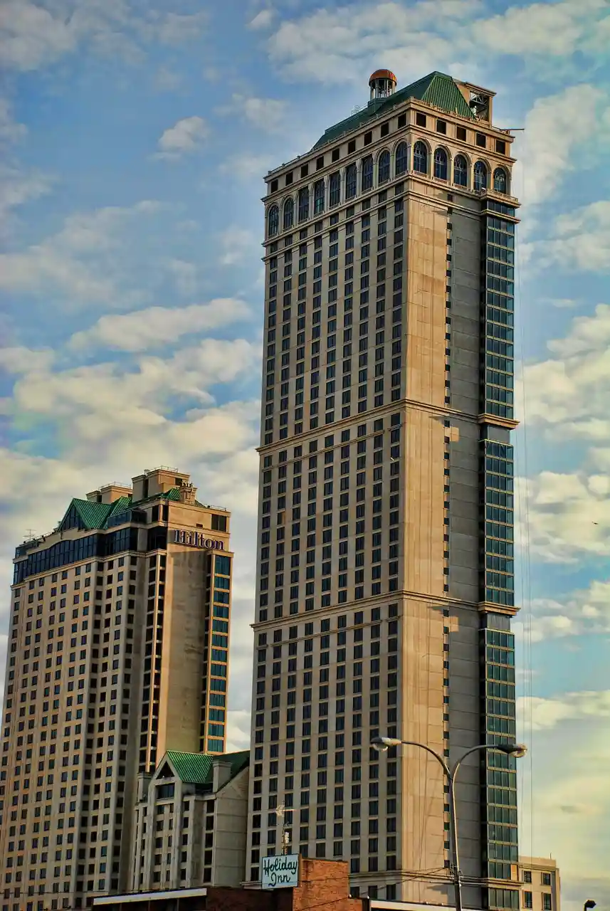 Hilton Niagara Falls/Fallsview Hotel and Suites' North Tower is a skyscraper-style hotel in Niagara Falls, Ontario, Canada. It was originally slated to rise 58 floors to a height of , but the building was subsequently reduced to 53 floors as verified by the hotel operator themselves and the new height has never been publicly released. The archived version of the page supports the tower height in floors and its position as the tallest hotel in Canada; the live page version does not. It has however clearly surpassed the Embassy Suites as tallest building in Niagara Falls and still has more than 500 rooms. It is also the tallest hotel in Canada. Read more on Wikipedia
