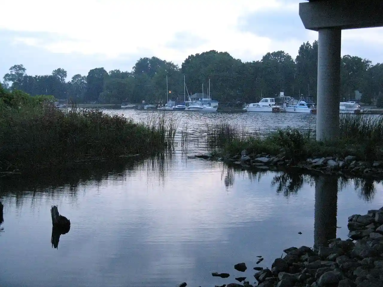 The Mnjikaning Fish Weirs are one of the oldest human developments in Canada. These fishing weirs were built by the first nations people well before recorded history, dating to around 4500 BP during the Archaic period in North America, according to carbon dating done on some of the wooden remnants. The weirs were built in the narrows between Lake Couchiching and Lake Simcoe, now known as Atherley Narrows, over which Ontario Highway 12 passes today. They were preserved by the water and layers of protective silt. Read more on Wikipedia