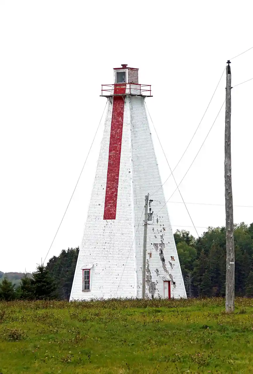 The Annandale Range Lights are a set of range lights on the east coast of Prince Edward Island, Canada. The range was established in 1898 but is now inactive. The original front range light was relocated in 1990, and was replaced by a new building of a similar design that now operates as a sector light. The lights are white pyramid-shaped structures of different heights, each with a red vertical stripe. Read more on Wikipedia