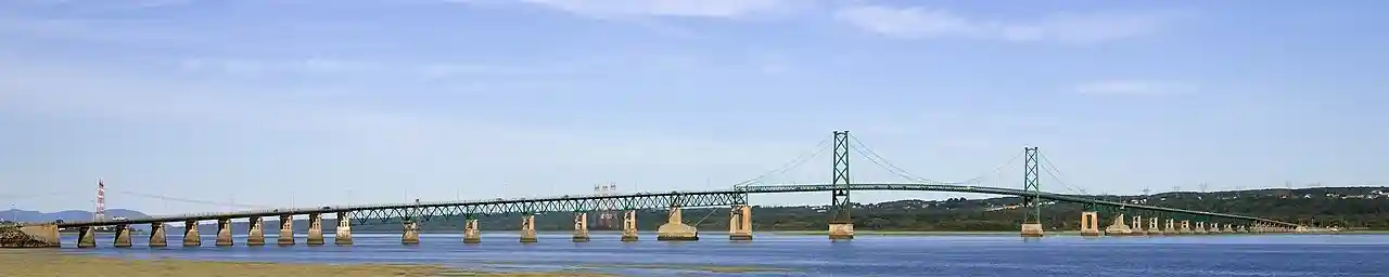 The Île d'Orléans Bridge, known locally as the Pont de l'Île, is a suspension bridge that spans the Saint Lawrence River between the Beauport borough of Quebec City and Île d'Orléans (Orléans Island) in the Canadian province of Quebec. It is part of Quebec Route 368 and connects to Autoroute 40 on the north side. Read more on Wikipedia