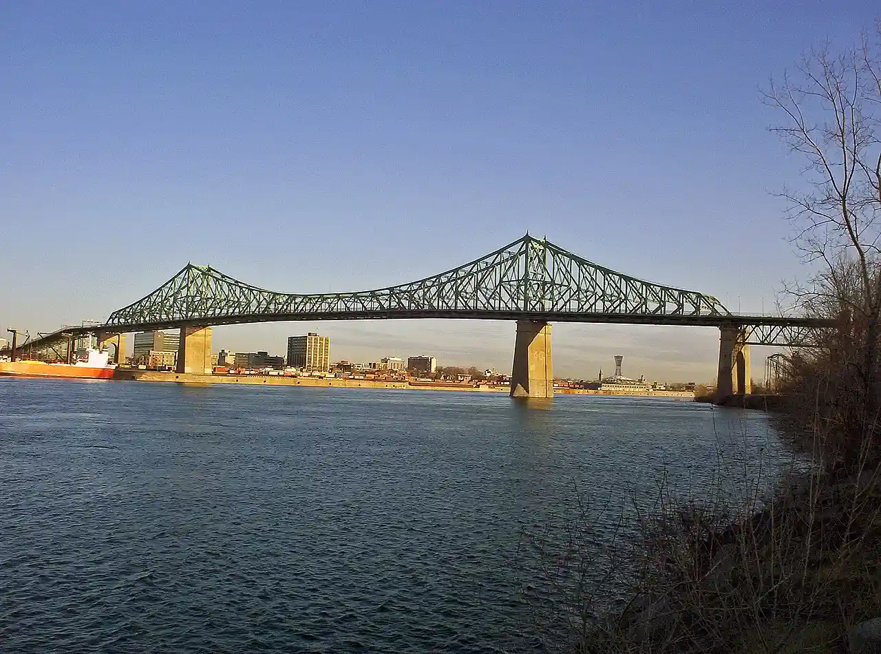 The Jacques Cartier Bridge () is a steel truss cantilever bridge crossing the Saint Lawrence River from Montreal Island, Montreal, Quebec, to the south shore at Longueuil, Quebec, Canada. The bridge crosses Saint Helen's Island in the centre of the river, where offramps allow access to the Parc Jean-Drapeau and La Ronde amusement park. Read more on Wikipedia