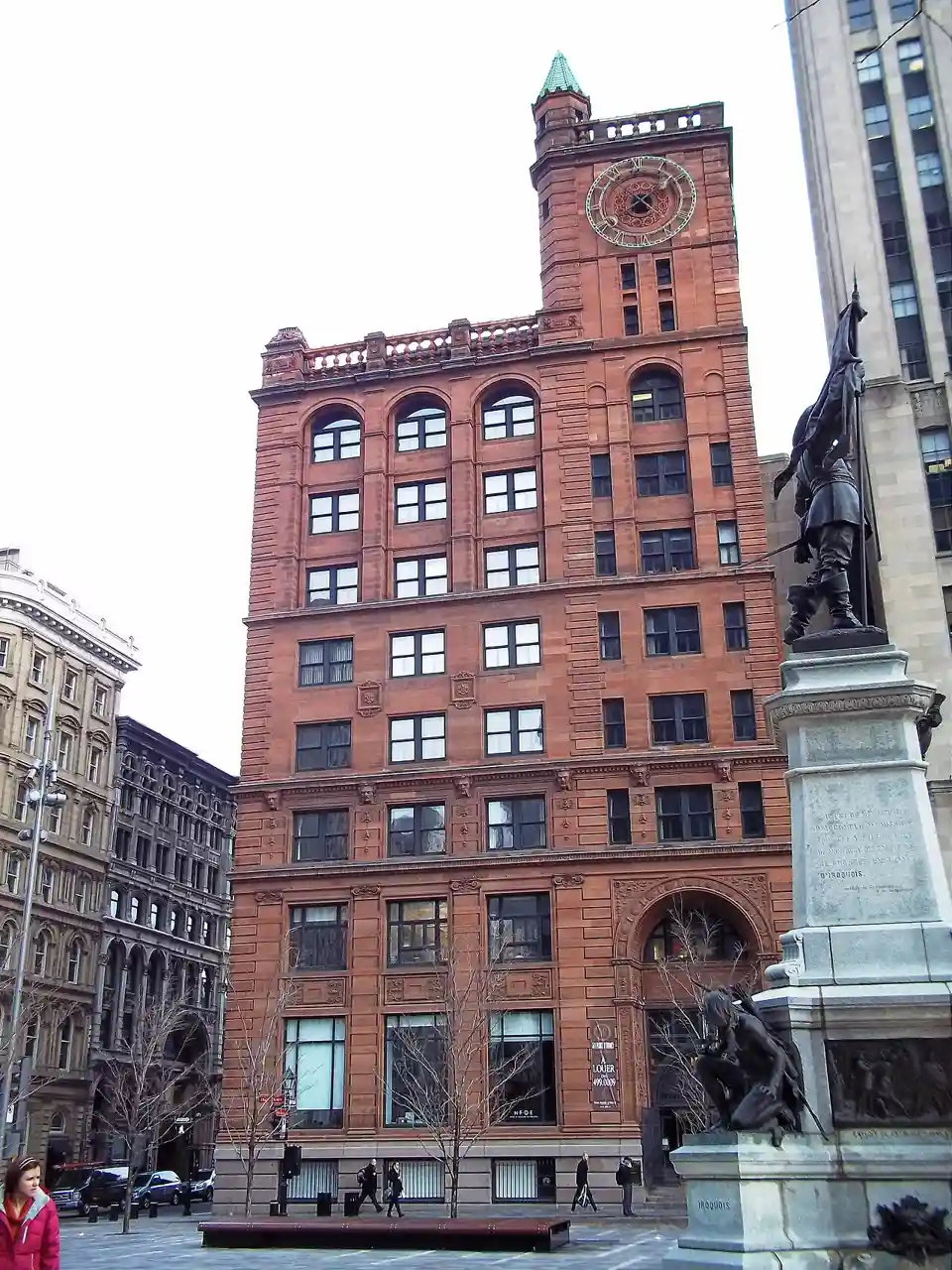 Montreal's New York Life Insurance Building (also known as the Quebec Bank Building) is an office building at Place d'Armes in what is now known as Old Montreal, erected in 1887–1889. At the time of its completion, it was the tallest commercial building in Montreal with the first eight floors were designed for retail office space, that quickly filled with the city's best lawyers and financiers. When the clock tower was completed, the owner filled the ninth and tenth floors with the largest legal library in the entire country as a gift to tenants. The building is next to another historic office tower, Aldred Building. Read more on Wikipedia