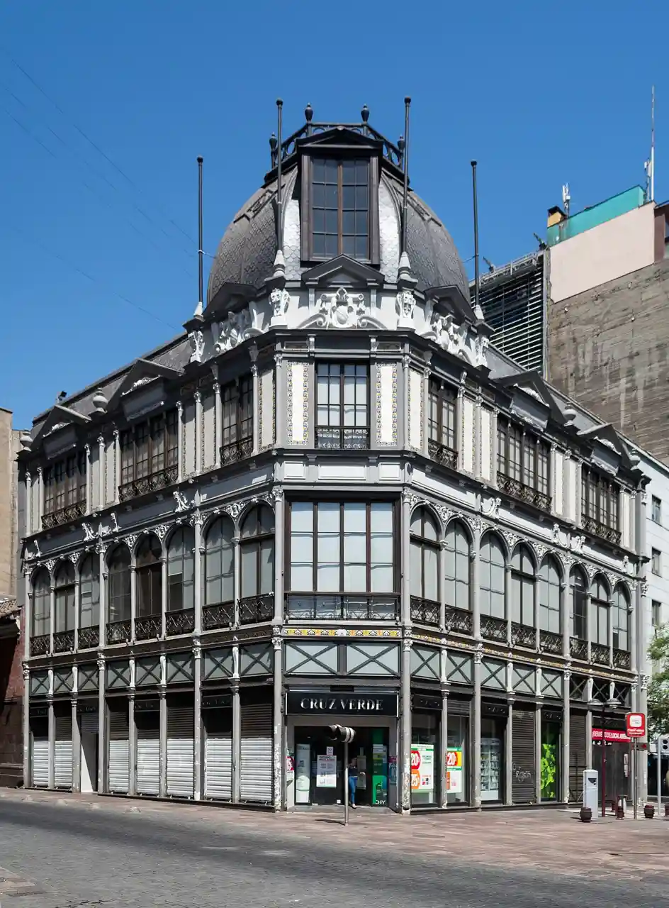 The Edificio Comercial Edwards is a cast-iron building used for retail, which is located at the corner of Merced and Paseo Estado streets, on the southeast side of the Plaza de Armas of Santiago. It was designed by Eugenio Joannon and prefabricated in France in 1892, for later being assembled in Chile. Read more on Wikipedia