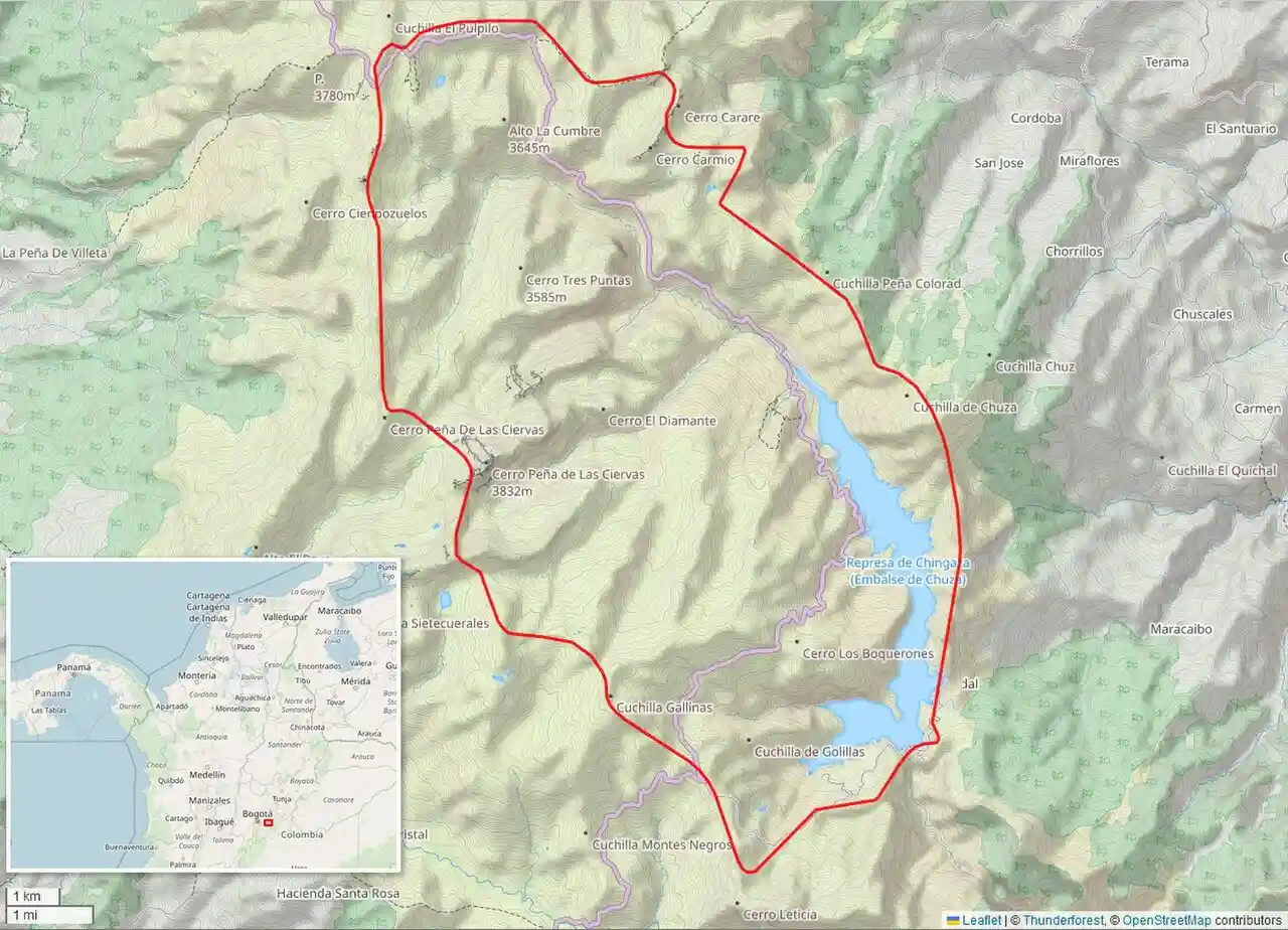 Chingaza Dam is a large dam in Colombia which supplies water to the capital city of Bogotá. The dam, on the Guatiquia River, is in the Chingaza National Park, northeast of Bogotá. The dam is gravel fill with a concrete face. Behind the dam, the Chuza Reservoir holds . Read more on Wikipedia