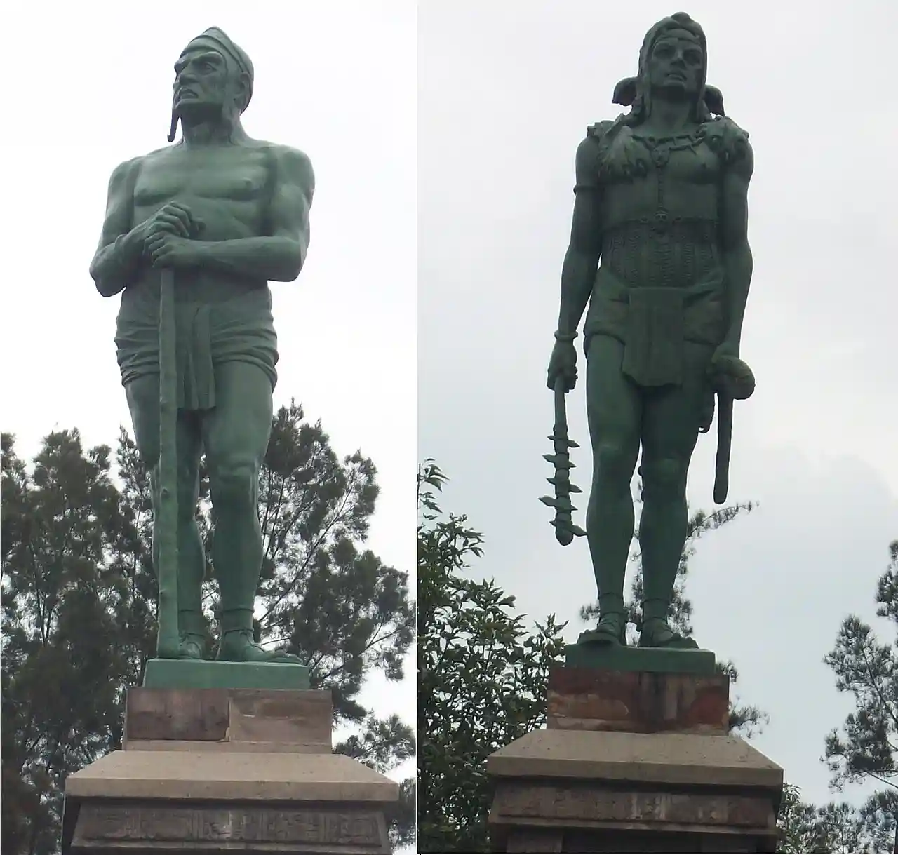 Statues of (Nahuatl for Aztec rulers) Ahuitzotl and Itzcoatl are installed in Mexico City. They are collectively known as the ("). The statues are verdigris due to the effects of weather. They are around to tall and their plinths have inscriptions in Nahuatl. The statues were created by Alejandro CasarĂn to represent Mexico at the 1889 Paris Exposition. Read more on Wikipedia
