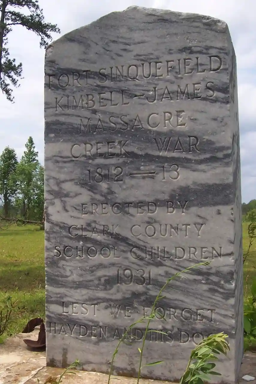 Fort Sinquefield is the historic site of a wooden stockade fortification in Clarke County, Alabama, near the modern town of Grove Hill. It was built by early Clarke County pioneers as protection during the Creek War and was attacked in 1813 by Creek warriors. Read more on Wikipedia