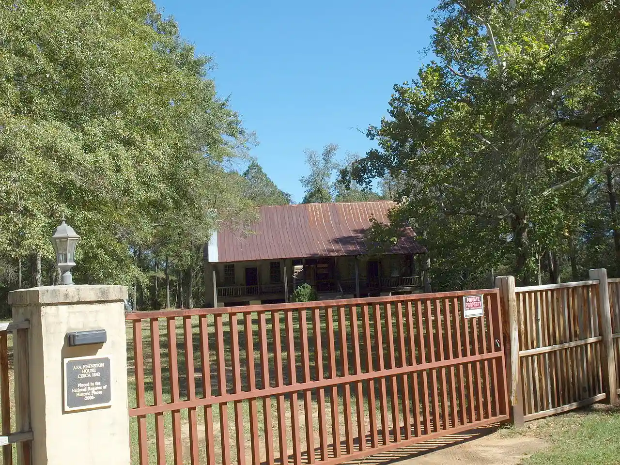 The Asa Johnston Farmhouse is a historic farmhouse in Johnstonville, Conecuh County, Alabama. The one story, spraddle roof dogtrot house was built in 1842 by Ezra Plumb for Asa Johnston. See also: Read more on Wikipedia