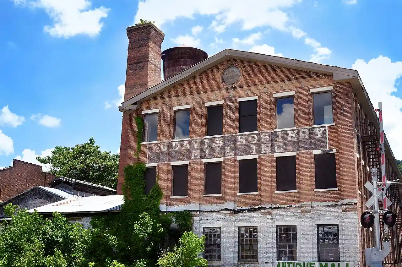 The W. B. Davis Hosiery Mill (also known as the Alabama Builders' Hardware Manufacturing Company Complex) is a historic industrial complex in Fort Payne, Alabama. It opened in 1884 in the midst of Fort Payne's economic boom, manufacturing building hardware and supplies. The main building, which features Colonial Revival details, is three stories tall, with 12-over-12 sash windows on each floor. An 85-foot (26-meter) chimney has a flared top and corbeled brick course, imitating a doric order column. By 1890, hopes that large quantities of iron ore and other minerals would be discovered in the Fort Payne district proved to be ill-founded. The ABHMC and seven of Fort Payne's other large manufacturers merged in an effort to remain in business, but they were unable to avoid bankruptcy. See also: Read more on Wikipedia