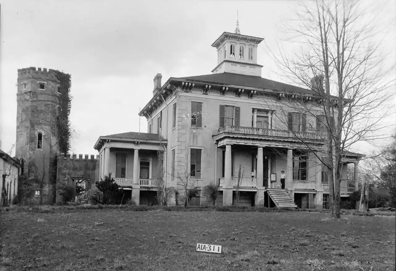 Rocky Hill Castle, also known simply as Rocky Hill, was a historic plantation and plantation house between Town Creek and Courtland, Alabama, United States. Once famed in Alabama for its architecture, it was an unusual mixing of neoclassical and picturesque aesthetics in one plantation complex. The house and tower suffered from neglect during much of the 20th century and were subsequently demolished in the 1960s. Much folklore surrounds the site, with Rocky Hill Castle being the subject of numerous ghost stories. The most notable story, "The Ghost of the Angry Architect", was published in Kathryn Tucker Windham and Margaret Gillis Figh's 1969 work 13 Alabama Ghosts and Jeffrey. Read more on Wikipedia