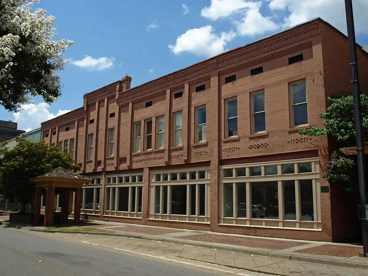 The Everett Building is a historic commercial building in Huntsville, Alabama. Built in 1899, it represents the Commercial Brick style of the late 1800s and early 1900s that eschewed the applied decoration of the Victorian style. The two-story building is divided into five storefronts, although only the southernmost two have entrances today. The upper floor is divided by pilasters between tightly spaced, one-over-one sash windows. Decorative patterned reliefs sit below each window. The building is topped with a parapet that has a course of dentils between courses of stepped brick. The center part of the parapet is raised, and flanked by a short, capped column pieces. The northern bay is visually separated from the others by a pilaster stretching the entire height of the building, and was formerly left unpainted, suggesting it may have been built at another time. See also: A covered, tree-lined alley separates the building from the Yarbrough Hotel to the north. The building was listed on the National Register of Historic Places in 1980. Read more on Wikipedia