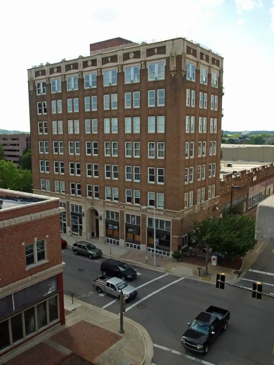 The Terry Hutchens Building is a historic office and apartment building in Huntsville, Alabama. The seven-story structure was originally constructed in 1925 for the Tennessee Valley Bank, with office space rented to other tenants. In 2002, the upper floors were renovated into condominiums. The structure is of steel reinforced concrete faced with brick, giving a Gothic Revival appearance. The ground floor façade has large display windows separated by brick piers, and has a central, arched entry covered in masonry. The Jefferson Street façade was originally treated the same way, but was modified with a flat wall of thin brick above two storefront entrances. A decorative band with rowlock course brick and terra cotta panels separate the ground floor from the rest of the building. Above, the piers divide each bay containing a pair of one-over-one sash windows; on the seventh floor, a green terra cotta frog sits on the sill, between the windows. Each bay of the cornice is divided by terra cotta decorated with Gothic shapes and medallions on panels of brick. See also: The building was listed on the National Register of Historic Places in 1980. Read more on Wikipedia