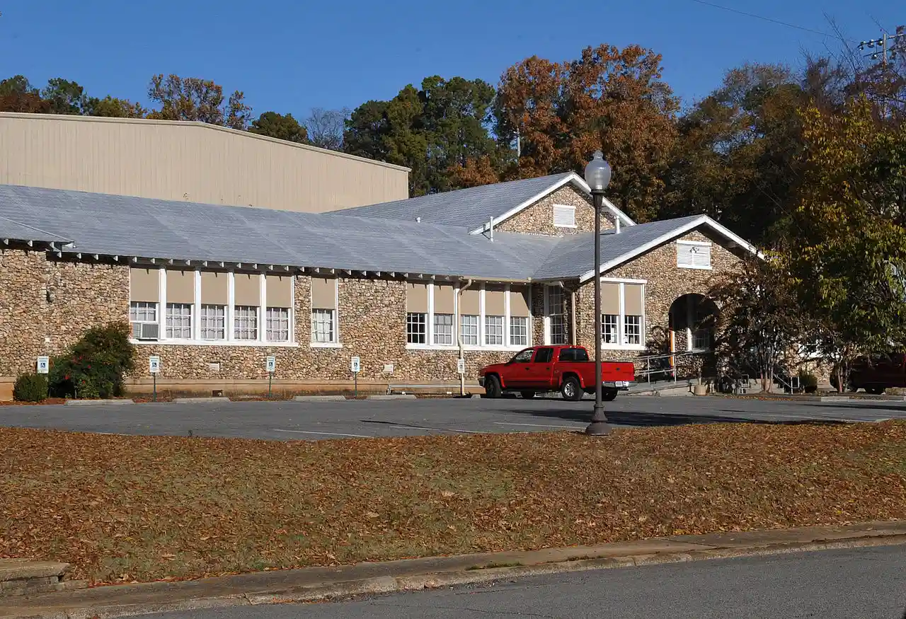 The Old Rock School (also known as the Guntersville City School) is a historic building in Guntersville, Alabama. The one-story building was constructed in 1926 in a flat-figure 8 shape, with two courtyards in the middle. It was built in the American Craftsman style, with rock facing and exposed rafters tails. The school was born of Progressive Era philosophy of providing proper facilities for education, including modern plumbing, proper lighting and ventilation, and ample open space. An auditorium allowed for classes in drama and music, as well as public concerts and performances. After the school was replaced in the 1970s, several other groups utilized the building. Its current tenant is The Whole Backstage, a non-profit youth drama organization. See also: A new, 337-seat auditorium was constructed in 2005. The building was listed on the National Register of Historic Places in 2003. Read more on Wikipedia