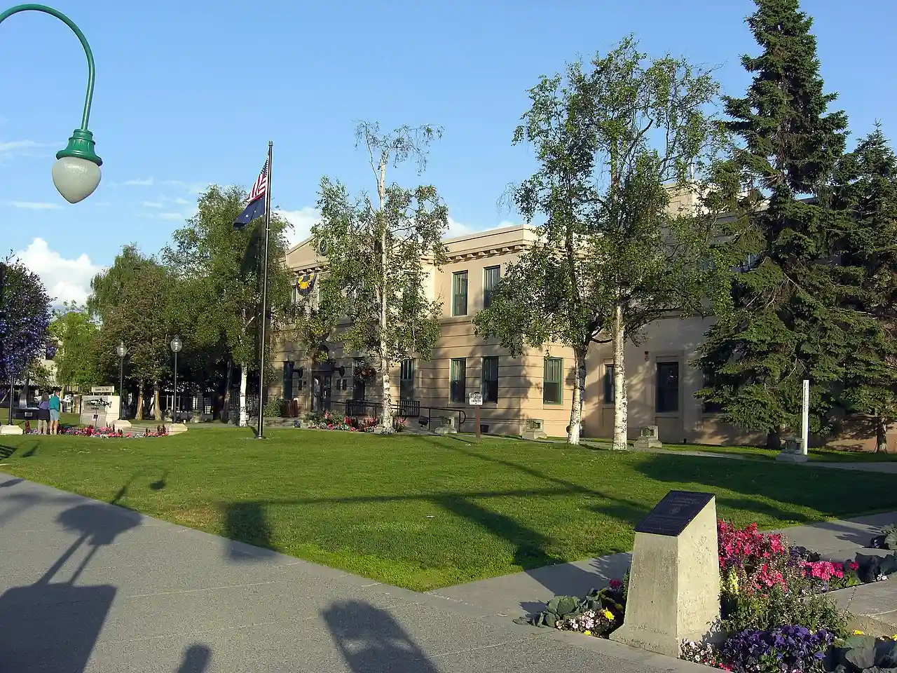 The Old Anchorage City Hall, also known as Historic City Hall, is located at 524 West Fourth Avenue in Anchorage, Alaska. It is a two-story cast concrete building, designed by E. Ellsworth Sedille and built in 1936 with funding from the Public Works Administration. It housed the city administration of the city until 1979, when most of the integrated city-borough administration was moved to the Hill Building at 632 West 6th Avenue. Read more on Wikipedia
