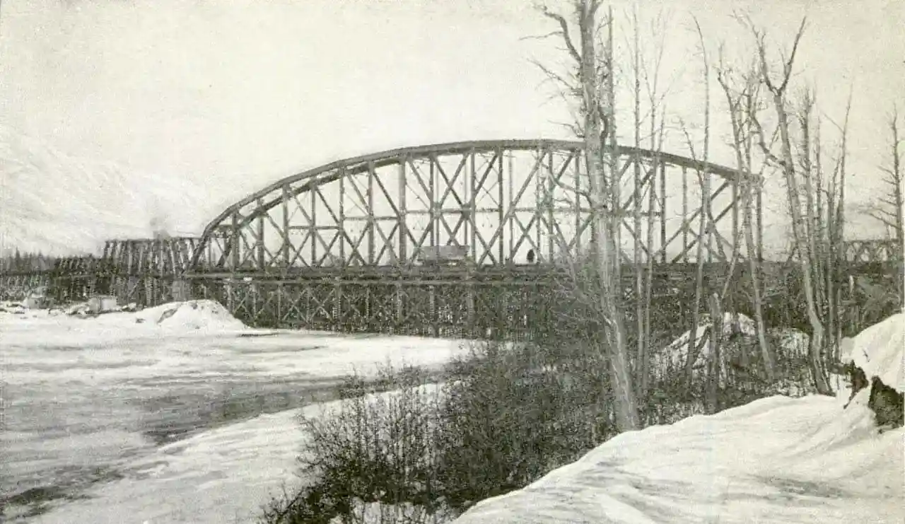 The Susitna River Bridge, also known as the Gold Creek Bridge, was the longest bridge span on the United States Government Railway in Alaska. The steel 504-ft. through-truss channel spans the Susitna River. It was completed in February, 1921. The crossing of the Susitna includes two 121-ft. combination Howe truss flanking spans and two 70-ft. combination pony Howe truss end spans, with 392 ft. of trestle at the southern approach and 28 ft. at the northern approach, making a total length of 1,322 ft. It is located 150 miles north of Anchorage, and 264 miles north of the terminus at Seward. The bridge was listed on the National Register of Historic Places in 1977. Read more on Wikipedia