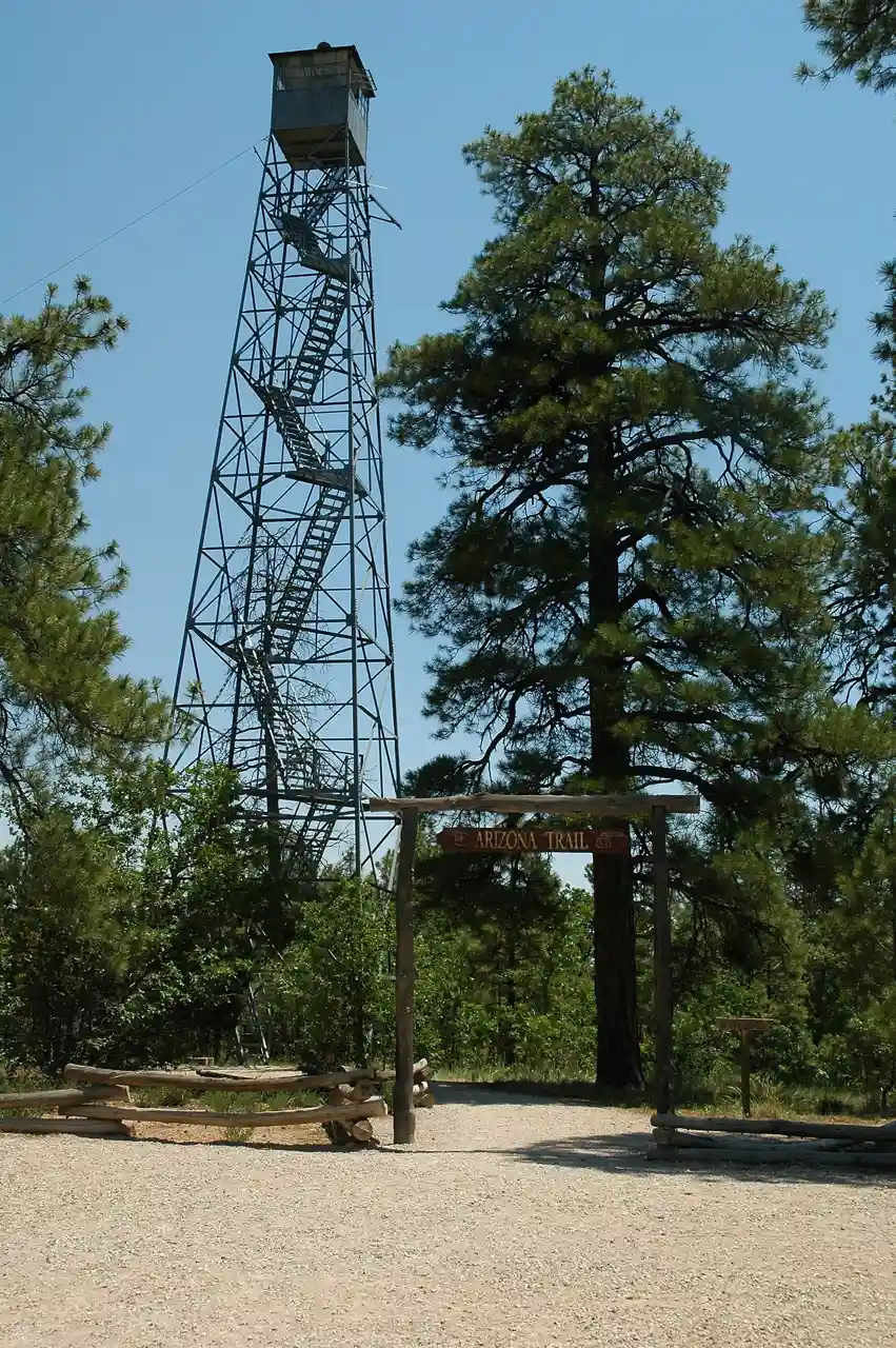 The Grand View Lookout Tower is a fire lookout in Kaibab National Forest near the South Rim of the Grand Canyon. The tall steel tower was built in the 1930s. Its observation cabin measures square. A small cabin is included in the designated area. Read more on Wikipedia