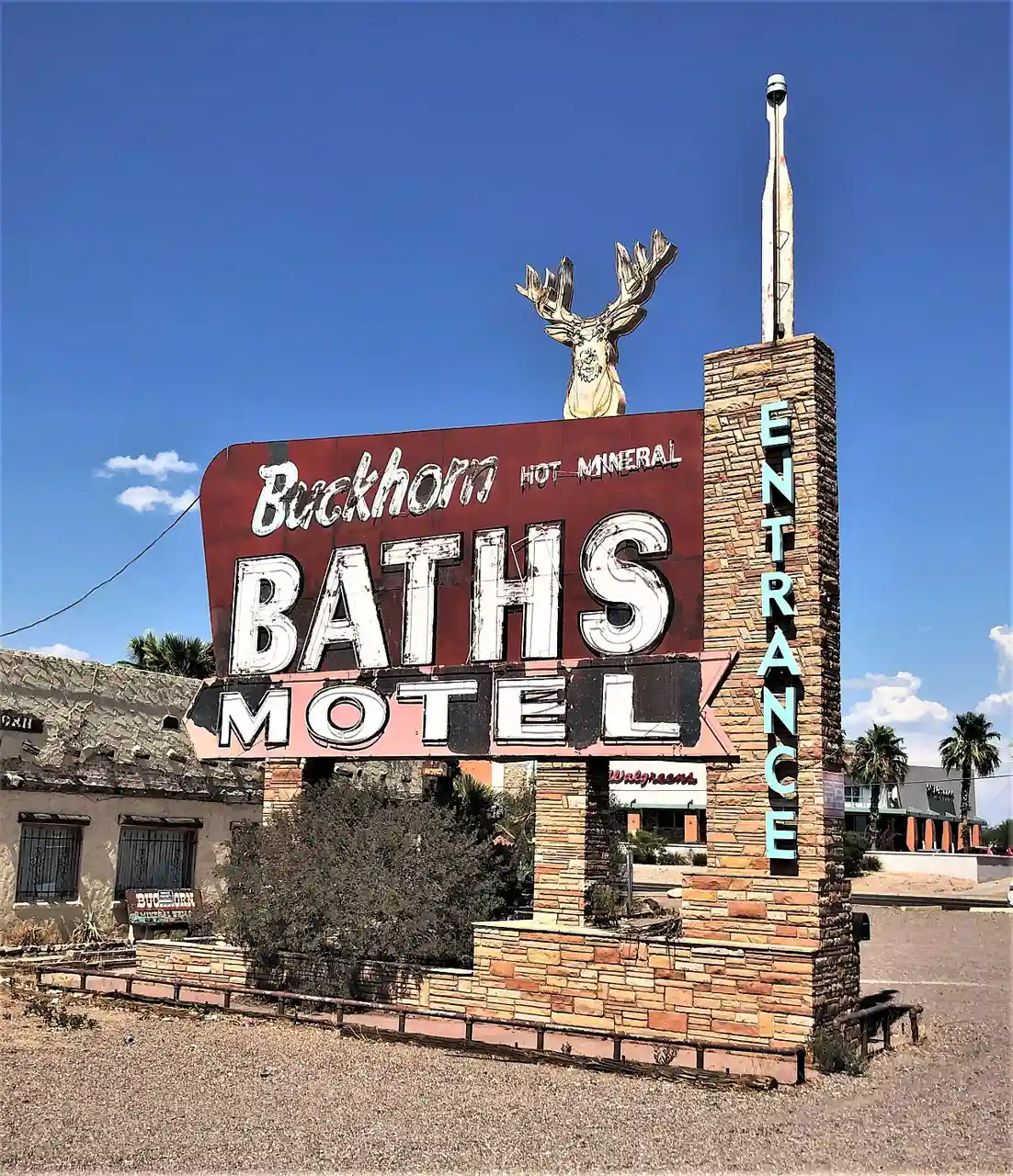 The Buckhorn Baths Motel at 5900 East Main Street at the corner of North Recker Road in Mesa, Arizona was a small mineral hot springs resort which offered a bathhouse as well as both cottages and motel rooms for overnight stays. Beginning in 1936 as a gas station and store, Ted and Alice Sliger developed the property into a resort complex which opened in 1939 and was virtually complete as of 1947. It continued to operate until 1999, when the bathhouse closed, although the motel and "Wildlife Museum" continued until 2004. Read more on Wikipedia