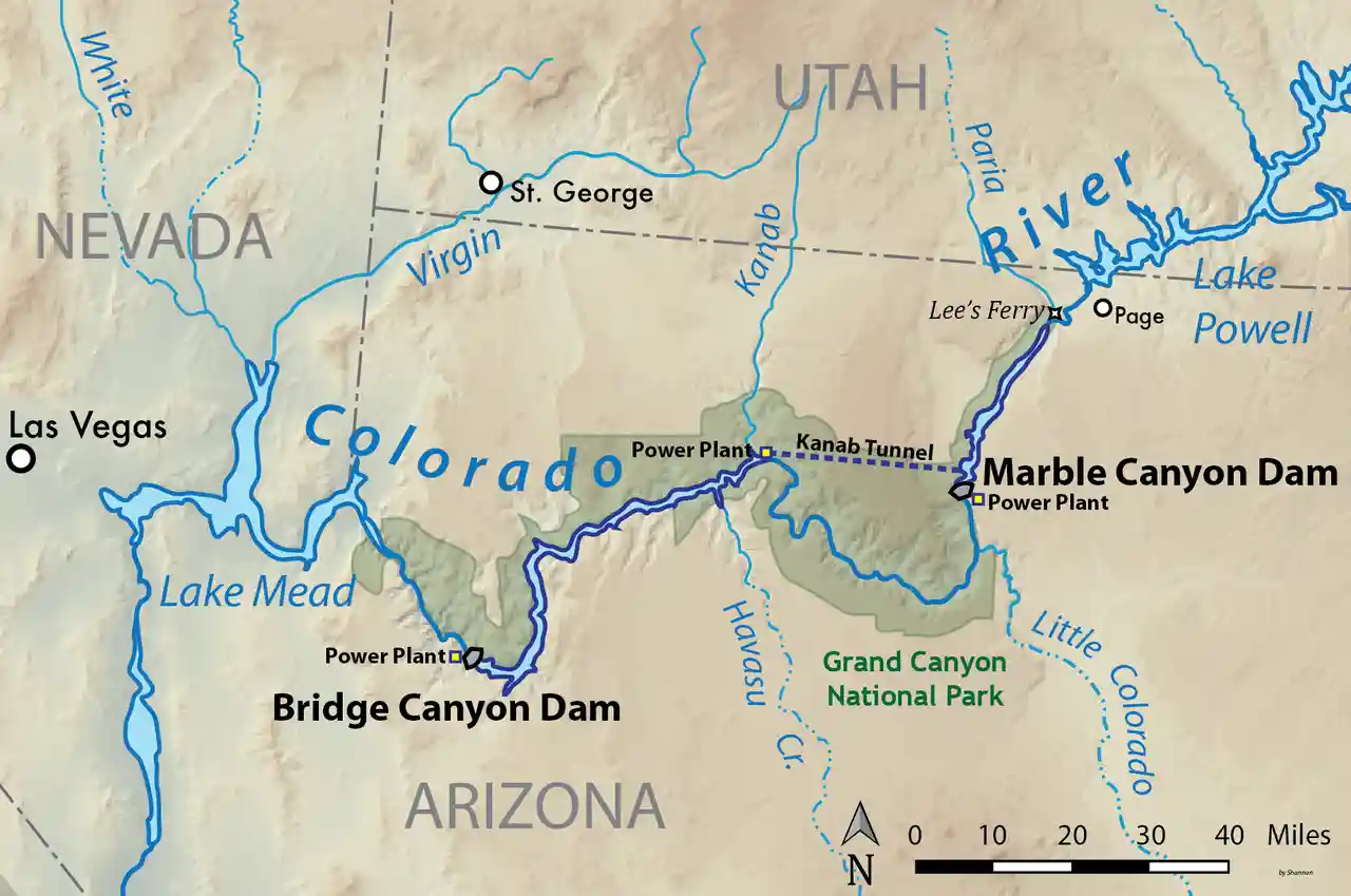 Bridge Canyon Dam, also called Hualapai Dam, was a proposed dam in the lower Grand Canyon of the Colorado River, in northern Arizona in the United States. It would have been located near Bridge Canyon Rapids in an extremely rugged and isolated portion of the canyon, downstream of Lees Ferry and at the uppermost end of Lake Mead. Read more on Wikipedia