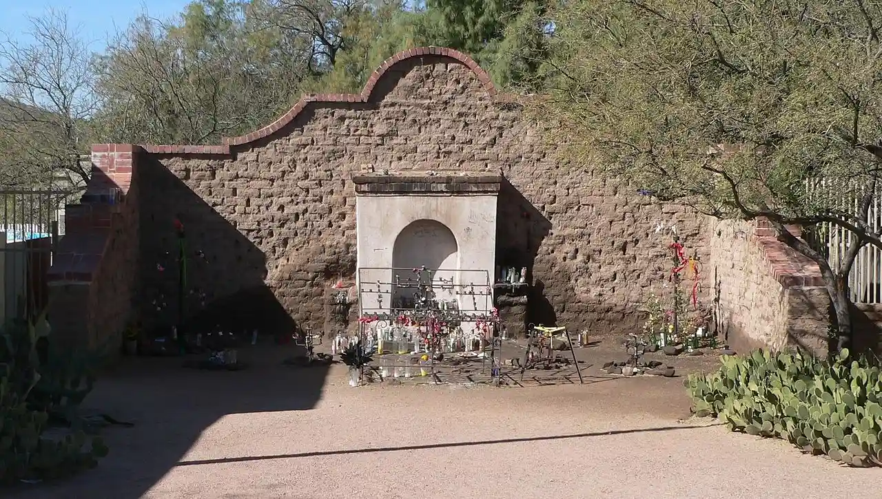 El Tiradito ("the little castaway") is a shrine and popular local spot located at 420 South Main Avenue in the Old Barrio area of Downtown Tucson, Arizona. Because of the site's association with pleas for supernatural intervention, it is also called the Wishing Shrine. The legends surrounding the site center around a broken-hearted man dying and, due to a sin, being unable to be buried on consecrated ground. The legends date to the 1870s, and the shrine has been present since at least 1891. Its name comes from the Spanish "tirar." The shrine was the first Arizona property to be placed on the National Register of Historic Places for its traditional cultural values. It is especially important to Tucson's Mexican and Mexican American communities. Read more on Wikipedia