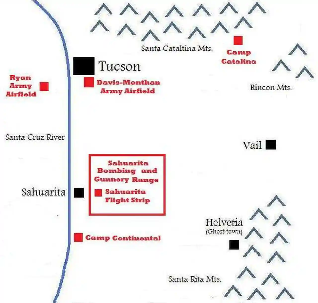 The Sahuarita Air Force Range, also known as the Sahuarita Bombing & Gunnery Range, was built just east of Sahuarita, Arizona, in 1942. It was used for the training of bombardiers, aerial gunners, anti-aircraft gunners, and others during World War II and the Korean War. The abandoned Sahuarita Flight Strip () is located in the southwestern corner of the range, and was used as an emergency flight strip until 1978. Before deactivation, the airspace over the range was protected by its own restricted area, R-310. Read more on Wikipedia
