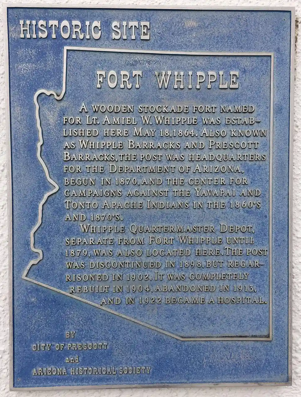 Fort Whipple is a former United States (U.S.) Army post that was temporarily established at Del Rio Springs, north of present-day Chino Valley, Arizona, and later relocated to a permanent site near present-day Prescott, Arizona. Read more on Wikipedia