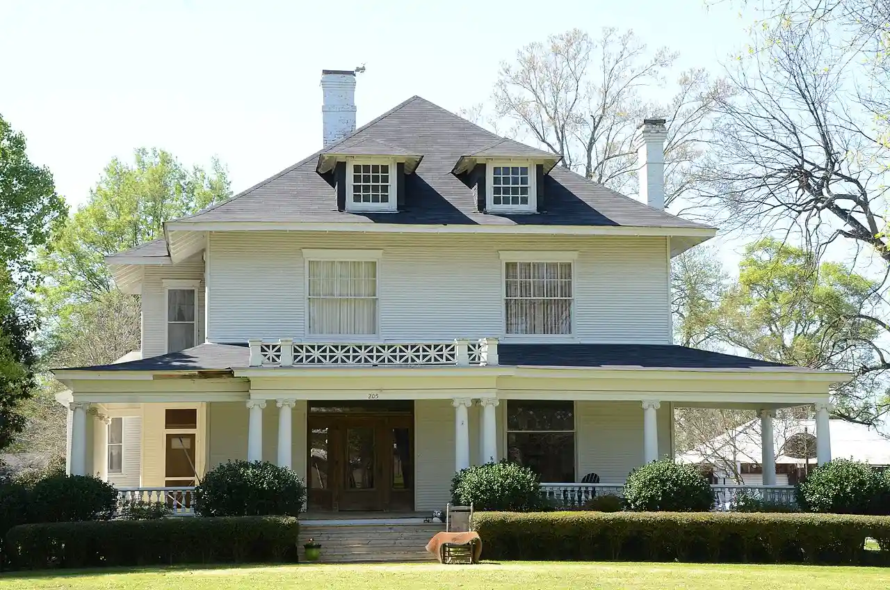 The Pugh House is a historic house on US Route 65 in Portland, Arkansas. The house was built c. 1905 to a design by architect Charles L. Thompson. It is a basic Foursquare house that has been elaborated by a hip roof with flared eaves, and a wraparound porch supported by Ionic columns and decorated with a neo-classical balustrade. Read more on Wikipedia