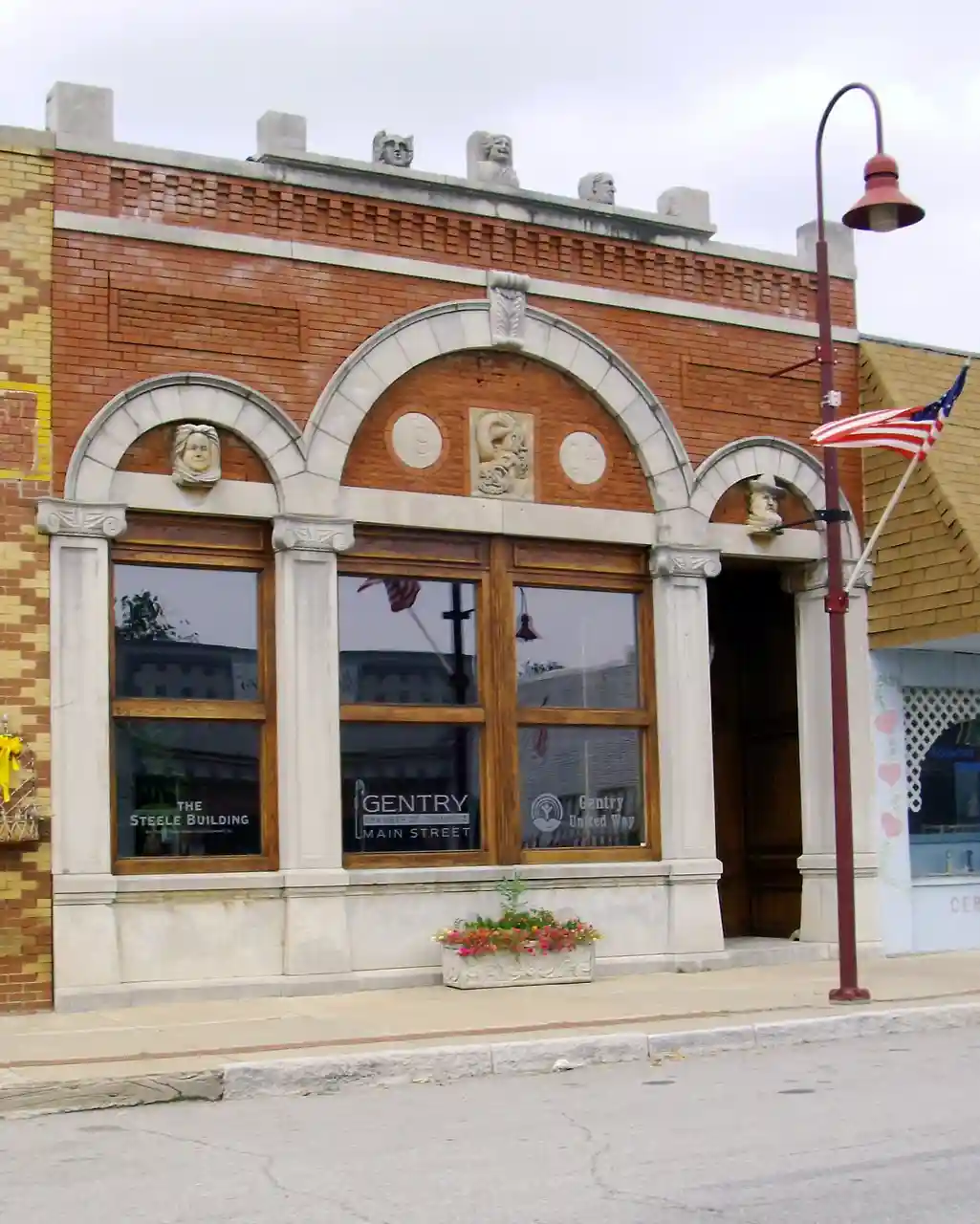 The Bank of Gentry is a historic bank building on Main Street in Gentry, Arkansas. Built in 1901, it is the most architecturally significant building in the city's downtown. Its main facade consists of three arched sections, the center one larger and higher than those that flank it. The arches are supported by pilasters with Ionic capitals. The building is capped by a string course and brick corbelling, with plain blocks and sculpted-head blocks as a decorative finale. Read more on Wikipedia