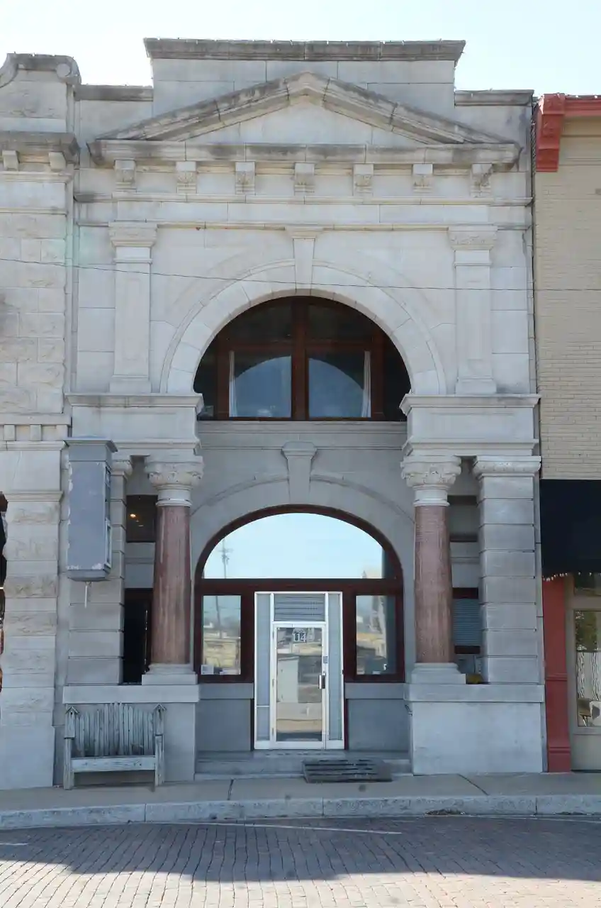 The Bank of Rogers Building is a historic commercial building at 114 South 1st Street in Rogers, Arkansas. It is an elegant two story Renaissance Revival structure with a limestone front. There are essentially two facades, one of which is set back under a large Roman arch, which forms the major element of the outer facade. This arch begins on the first level with square outer pillars and round inner ones, and is flanked on the second level by marble pilasters, which rise to support a projecting entablature and pediment. The inner facade has the main entrance under a segmented arch, with a pair of sash windows under a round arch on the second level. Read more on Wikipedia
