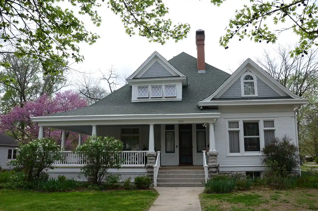 The Blackburn House is a historic house at 220 North Fourth Street in Rogers, Arkansas. It is a -story wood-frame structure, set on a stone foundation, with a busy roofline typical of Late Victorian styling, but with more stylistically Classical Revival features, such as turned columns supporting its wraparound porch. The house was built in 1907 by J. A. C. Blackburn, a lumber baron who controlled much of the timber industry in northwestern Arkansas. Blackburn built the house as a showcase for his wood products. Read more on Wikipedia