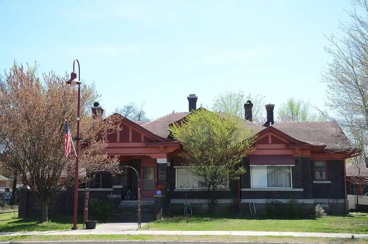 The Carl House is a historic house at 70 Main Street in Gentry, Arkansas. It is a -story brick building with a flared hip roof and an array of hip-roof and gabled dormers. Its front porch is supported by square brick columns, and its gable is decorated with half-timbering, as are other gable ends. The house was built in 1913 by R. H. Carl, president of a local bank, and is a fine local example of Craftsman/Bungalow architecture. Located on Main Street, the fine architectural details such as the sweep of the roof, the coping around the porch, the irregular plan and the matching ancillaries grab the attention of all who pass. Read more on Wikipedia