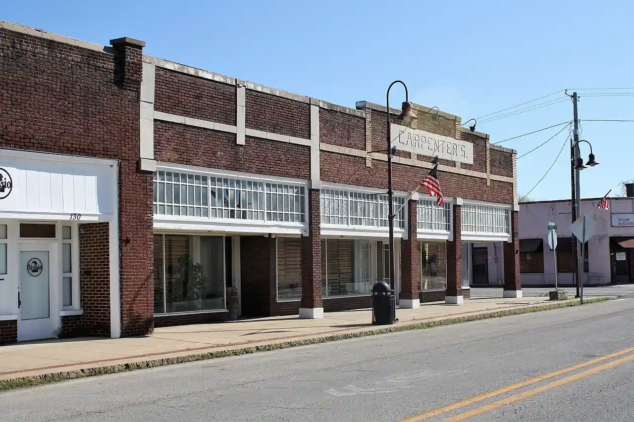 The Carpenter Building is a historic commercial building at 136 East Main Street in Gentry, Arkansas. Built in 1927–29, it is a single-story masonry structure, its exterior finished mainly in red brick and hollow clay tile. A stepped parapet obscures the flat roof, and the front facade is inset with square pier supports, giving the impression of a portico. The interior includes surviving original sections of tin ceilings. The building originally housed a retail grocery, as well as a mortuary and funeral chapel, but has since been repurposed to other uses. Read more on Wikipedia