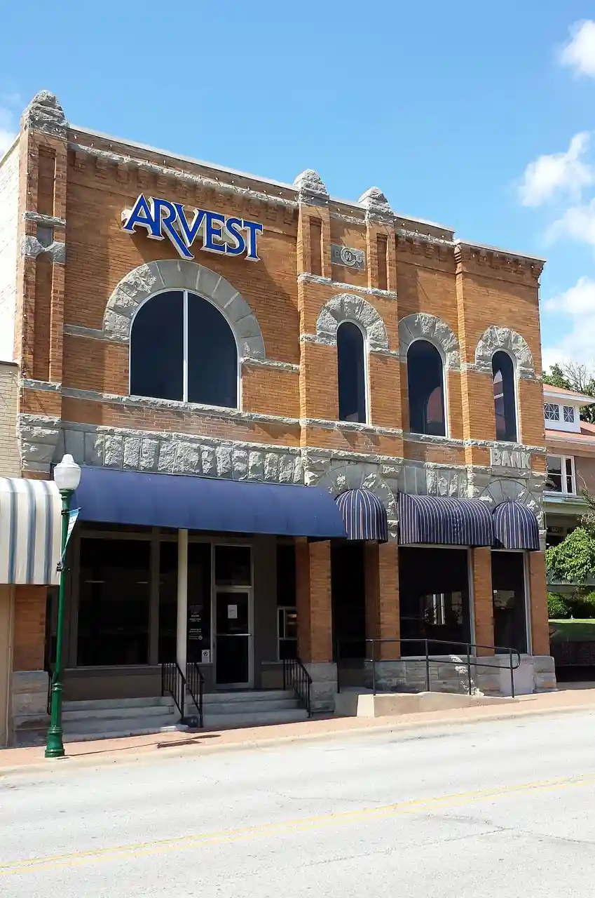 The First National Bank is a historic commercial building at 109 East University Street in Siloam Springs, Arkansas. It is a two-story brick building, trimmed in stone. Its ground floor is recessed in an arcade supported by square posts, and is separated from the second floor by a stone belt course. The upper floor windows have round stone arches, with two narrow bays projecting slightly. The cornice has corbelled brickwork, and is topped in a few places by stone caps. The building is Siloam Springs' only significant example of Romanesque Revival architecture. Read more on Wikipedia