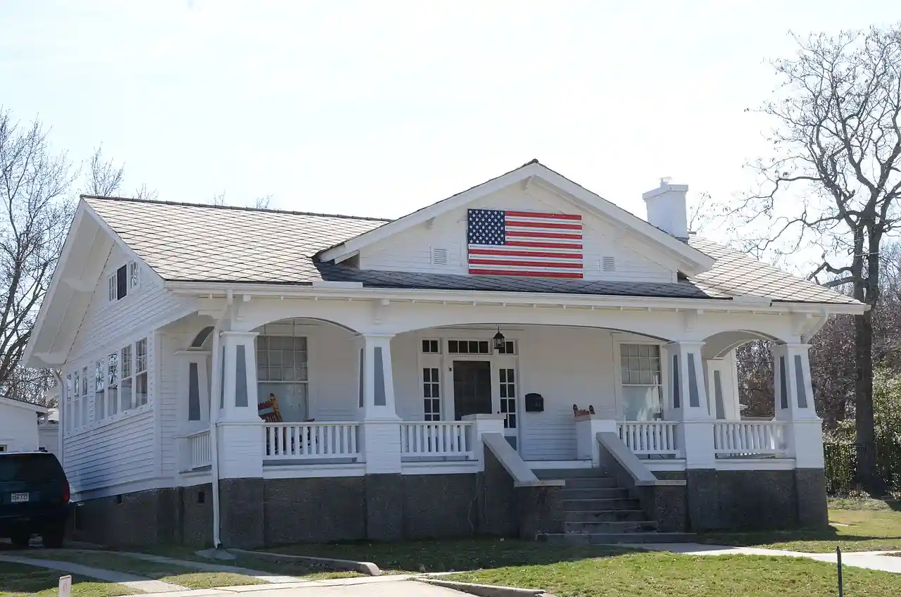 The Kefauver House is a historic house at 224 West Cherry Street in Rogers, Arkansas. Built around 1920 by local businessman W. E. Kefauver, this 1½ story wood-frame structure exemplifies the Bungalow style, with a broad porch supported by tapered square columns, and an arched architrave highlighting the opening where the stairs lead upward. It has hip roof with wide overhangs, and a broad shallow-pitch gabled dormer on the front facade. Read more on Wikipedia
