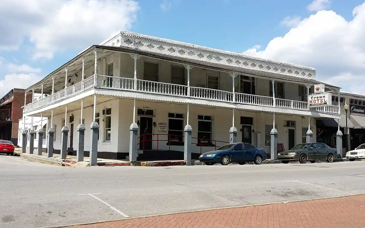 The Crown Hotel, formerly the Lakeside Hotel is a historic hotel building at 119 West University Street in Siloam Springs, Arkansas. It is a two-story brick building in an L shape, with a hip roof topped by a low cupola. It is distinguished by the brickwork at the roofline, and by the delicately spindled two-story porch that wraps around two sides of the building. Built in 1881, just one year after the city's founding, it is one of the city's oldest commercial buildings, and may have been its first brick hotel. Read more on Wikipedia