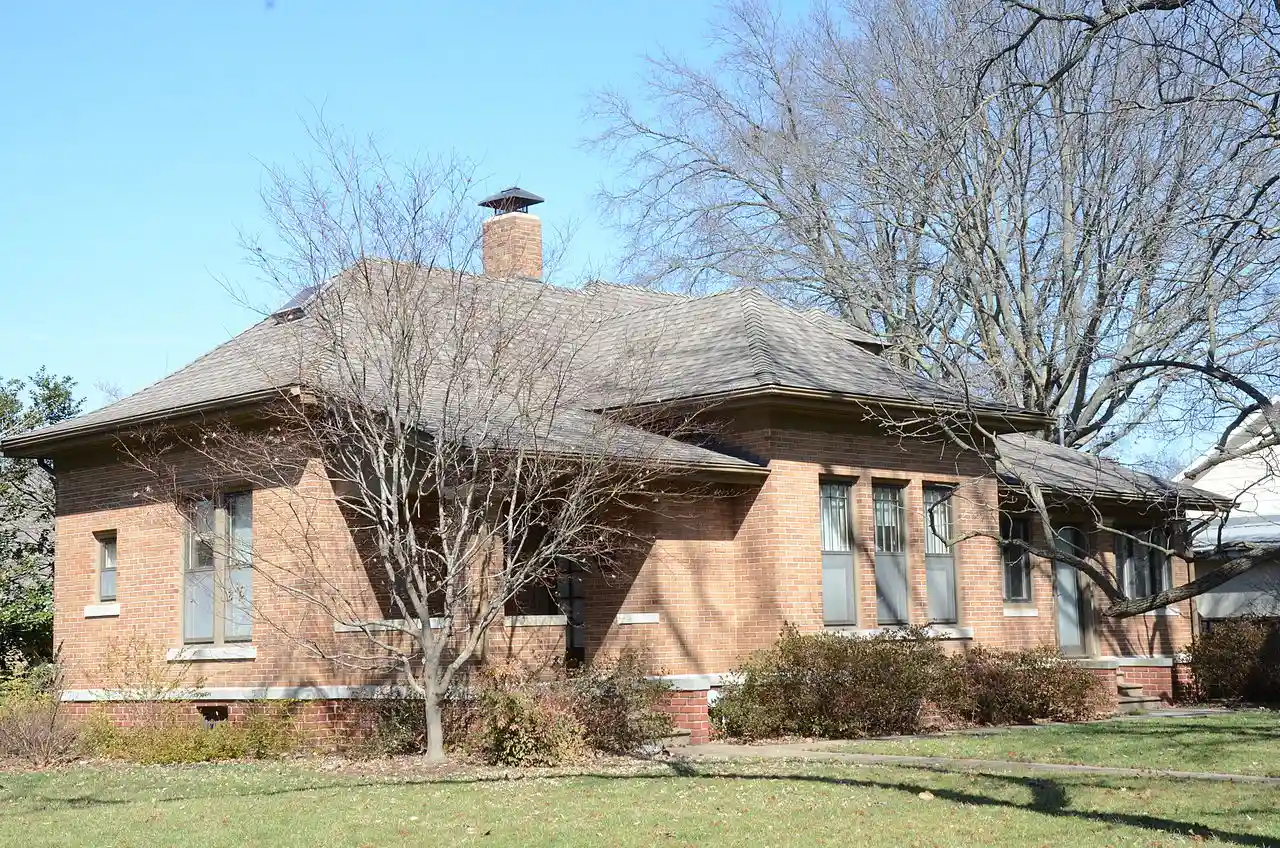 The Merrill House is a historic house at 617 South Sixth Street in Rogers, Arkansas. It is a single-story brick and masonry structure, with a hip roof that has a bell-cast shape and wide overhangs. A central projecting section has a grouping of three windows and is flanked on both sides by porches, one screened and one open. The arrangement of windows as well as the horizontal organization of stone and brickwork is all reminiscent of the Prairie School of Frank Lloyd Wright. The house, built in 1917, was a nearly complete rebuild of an older (c. 1880) house. Its designer and owner was A. W. Merrill, a local woodworker and lumber yard owner. It is the only Prairie School-influenced house in Rogers. Read more on Wikipedia