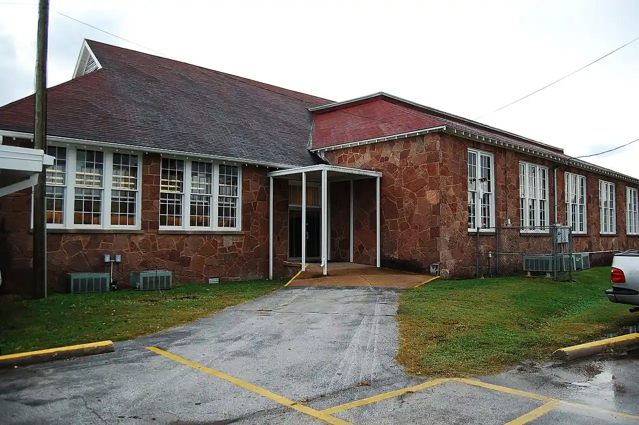 The Valley Springs School is a historic school building at 1 School Street in Valley Springs, Arkansas. Now part of a larger school complex, it is a single-story fieldstone structure with a wide south-facing facade, and a gable-on-hip roof. There are two entrance pavilions, marked by steeply-pitched gable projections. The left entrance is deeply recessed under a rounded archway, while that on the right, although also recessed, has a flat-roofed pavilion sheltering access to it. Fenestration is provided by groups of sash windows arranged symmetrically across the facade. The school was built in 1940 with funding from the Works Progress Administration, and originally served as the community's high school. Read more on Wikipedia
