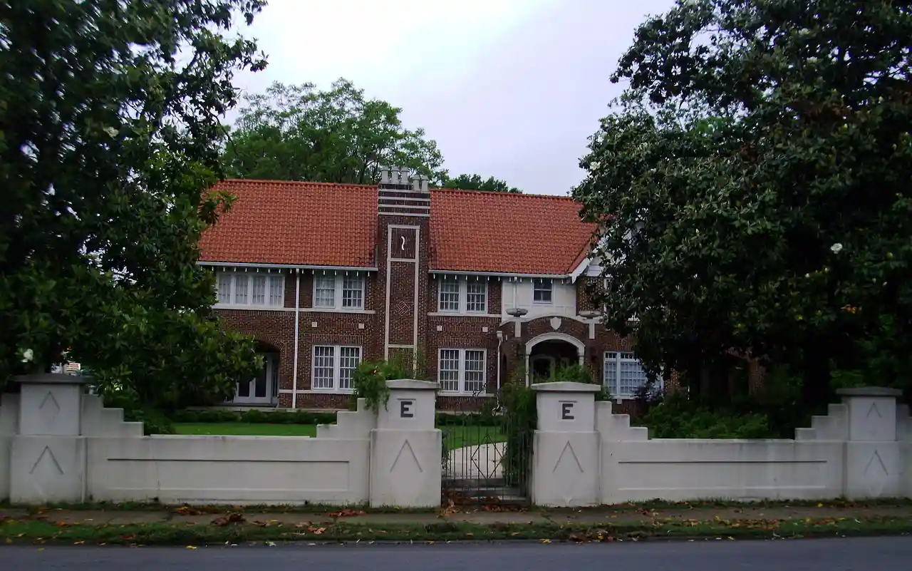 The Ederington House, known locally as the "E" House for the decorations on its fences, is a historic house at 326 South Main Street in Warren, Arkansas. It was built in 1926-27 for Louis Ederington, a local shopowner. It was designed by H. Ray Burks, an architect of some local reputation whose other designs include the Blankinship Motor Company Building and the Drew County Courthouse. This house is one of a few definitely attributed to Burks, and is set on imposing grounds in central Warren. The house is built primarily of red brick, with stucco gable ends and cast stone trim details. The property is lined on two sides by a concrete fencing with iron gates. The posts flanking the driveway and lining the fence are topped by large bronze "E"s. Read more on Wikipedia