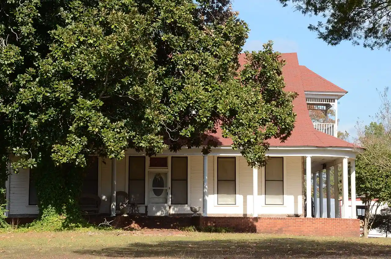 The Dunn House in Hampton, Arkansas is an early 20th vernacular farmhouse. The -story L-shaped wood-frame house was built in 1909 for the Dunn family, which continues to own the property. It features a center gable dormer on the front facade, which includes a small eyebrow window, and a porch extending the width of the front supported by 18 Doric columns. Read more on Wikipedia