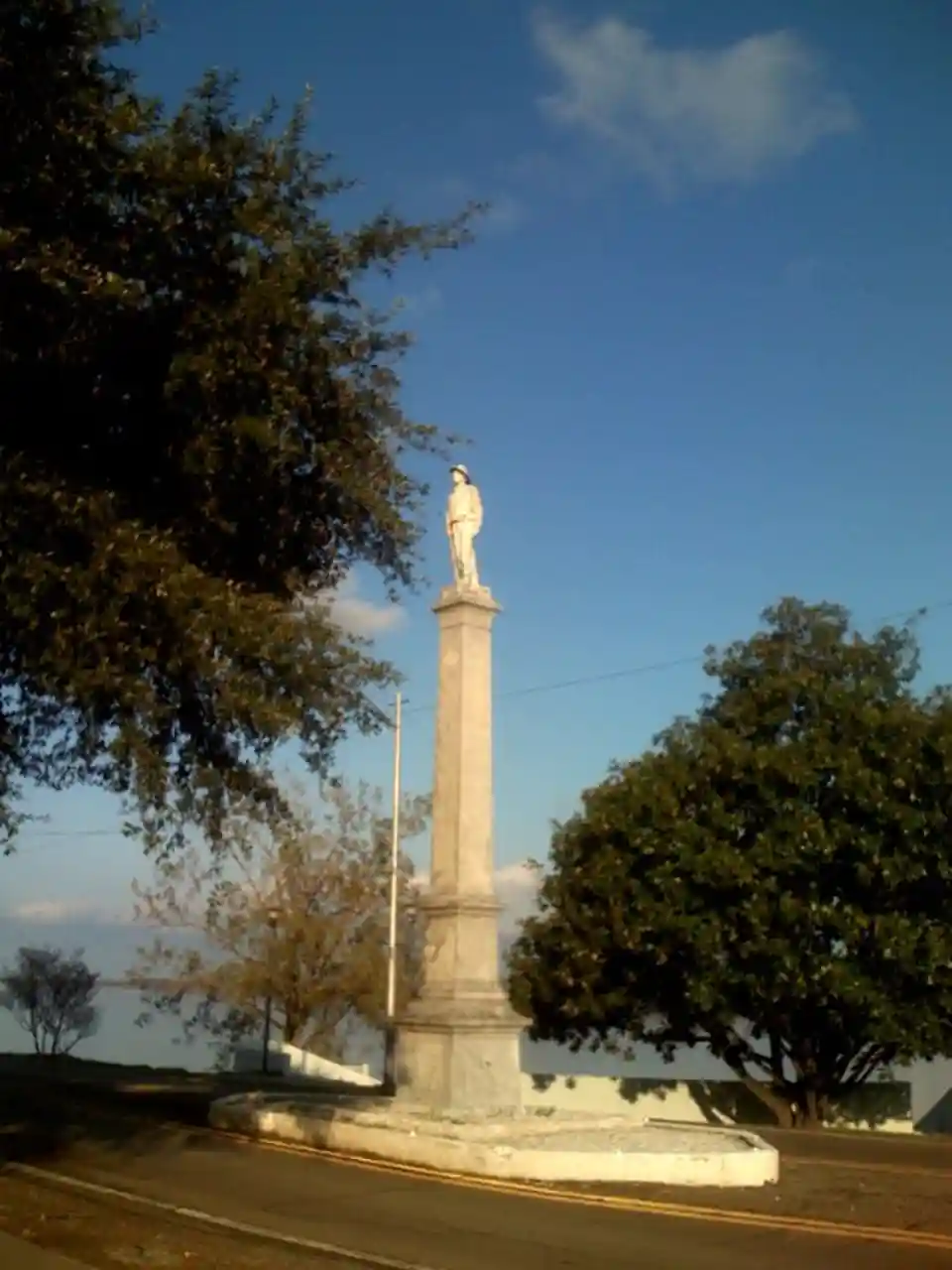 The Lake Village Confederate Monument is located on the median of Lakeshore Drive, between Main and Jackson Streets in Lake Village, Arkansas. The marble monument depicts a Confederate Army soldier standing in mid stride with his left foot forward. His right hand holds the barrel of a rifle, whose butt rests on the monument base. He carries a bedroll draped over his left shoulder, and wears a Confederate cap. A cannon that served as a fountain was once part of the sculpture, but is now missing. The statue is about high and square; it rests on a marble foundation that is long, wide, and high. The monument was erected in 1910 by two chapters of the United Daughters of the Confederacy at a cost of about $3,000. Read more on Wikipedia