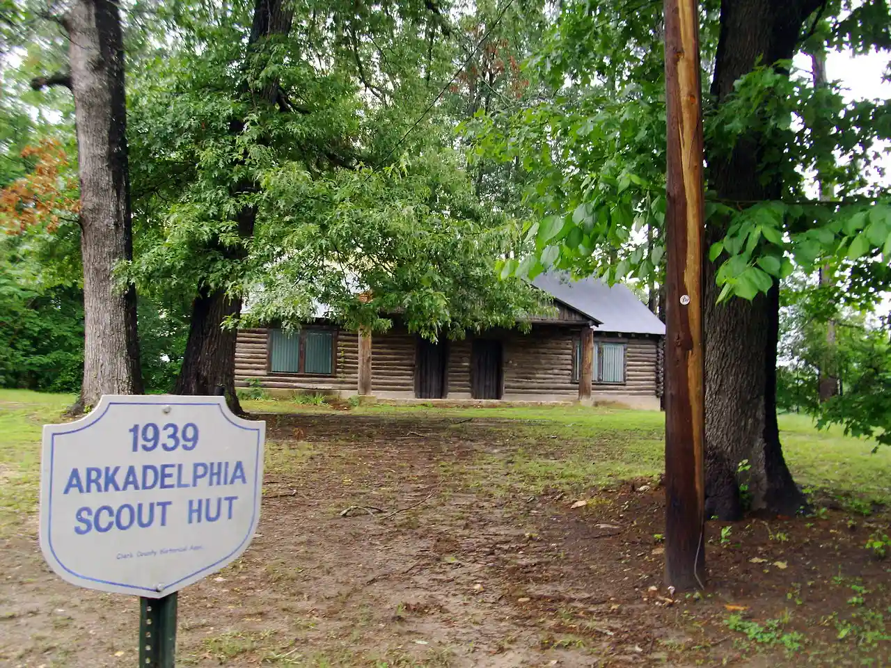 The Arkadelphia Boy Scout Hut, located in Central Park in Arkadelphia, Arkansas is on the National Register of Historic Places. Since the roof and the original shutters and windows were replaced in 1953, in the Hut is precluded from being listed on the National Register under Criterion C. However, it listed under Criterion A as a "property that made a contribution to the major pattern of American history". Read more on Wikipedia